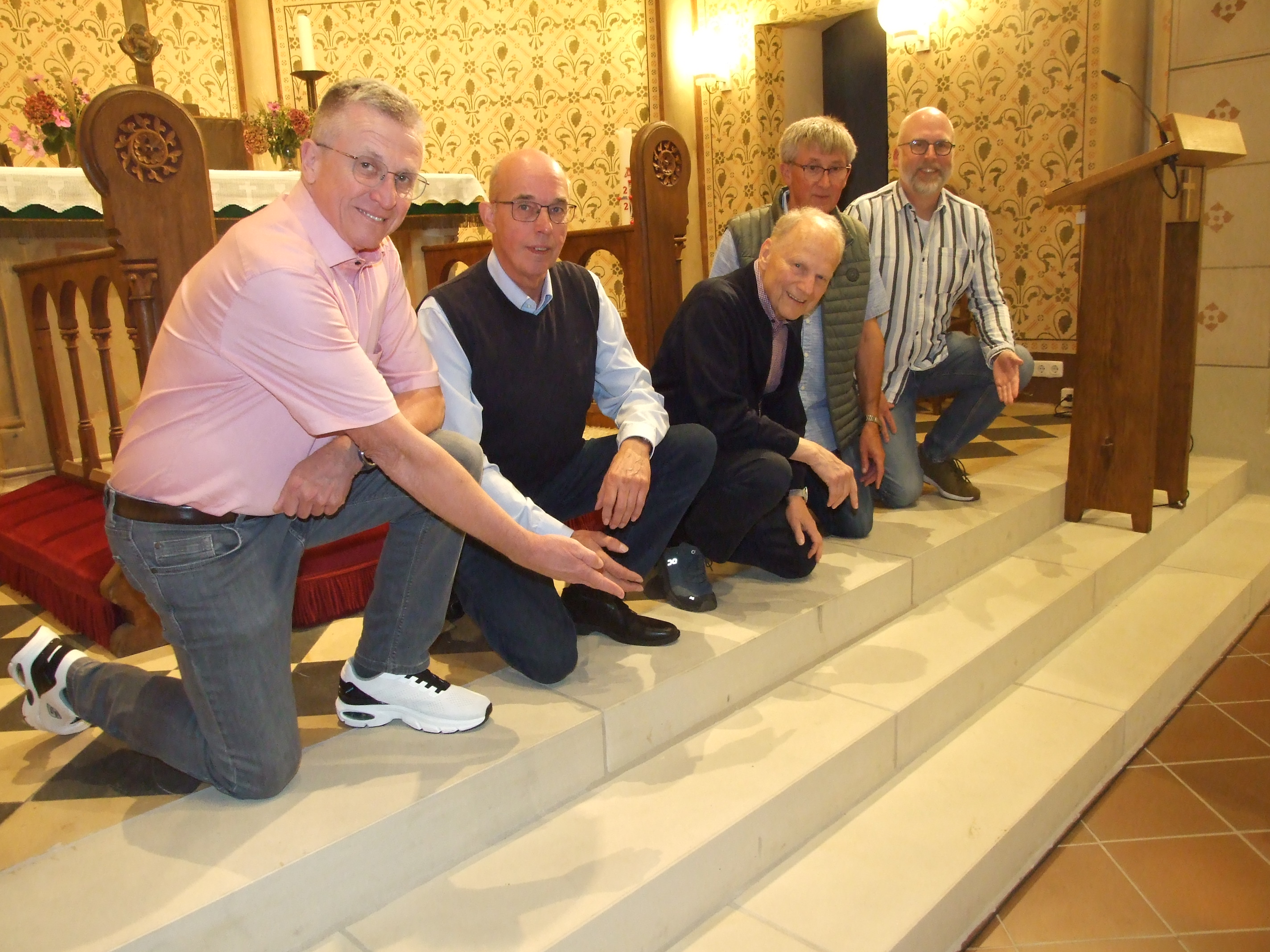 Mit gleich zwei vom Kirchbauförderverein finanzierten Renovierungsvorhaben trat man jetzt an die Öffentlichkeit. Zum einen wurden mit Hilfe von Spenden die drei Altarstufen zum Chorraum erneuert und durch hellere Tritte aus Sandstein ersetzt.