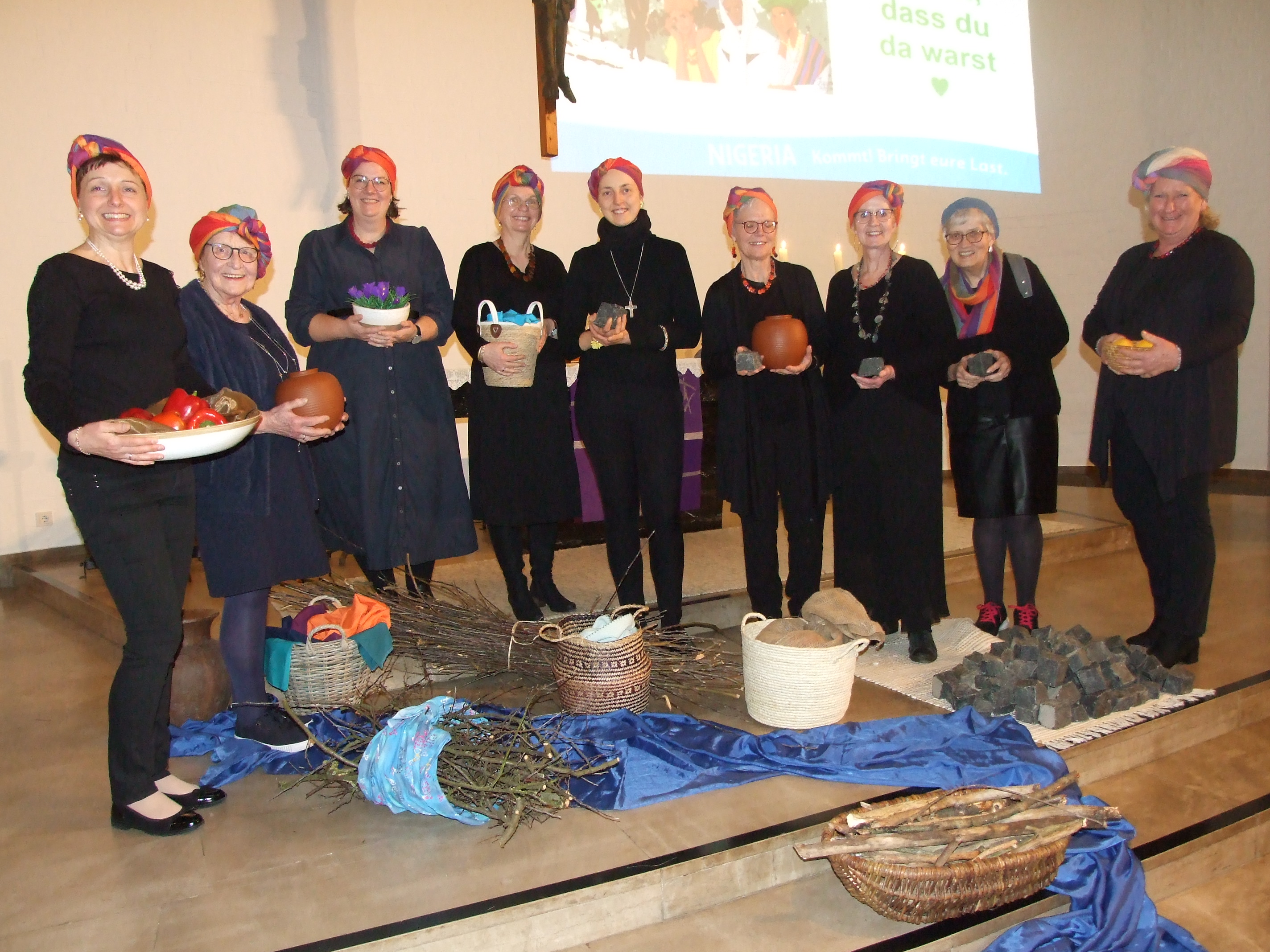 Die biblische Verheißung aus dem Matthäus-Evangelium greift ein alltägliches Bild aus Nigeria auf: das Tragen schwerer Güter auf dem Kopf. In einer Art Prozession trugen die Espelkamper Frauen, die durch ein Kopftuch in Regenbogenfarben gekennzeichnet waren, Lasten in den Altarraum – Lasten, wie sie in Nigeria üblicherweise von Frauen getragen und ertragen werden müssen.