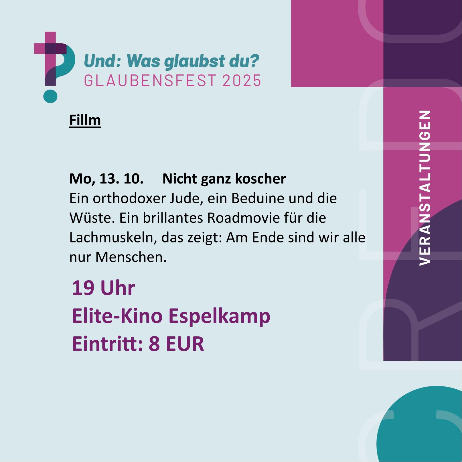Im Rahmen der diesjährigen Veranstaltungsreihe "Und: was glaubst du? Glaubensfest 2025" veranstaltet der Ev. Kirchenkreis Lübbecke in Zusammenarbeit mit dem Elite-Kino in Espelkamp eine Filmreihe. Jeweils am 2. Montag in den Monaten September bis Dezember wird ein Film gezeigt, der in besonderer Weise eine Antwort gibt auf die Frage "Was glaubst Du?".